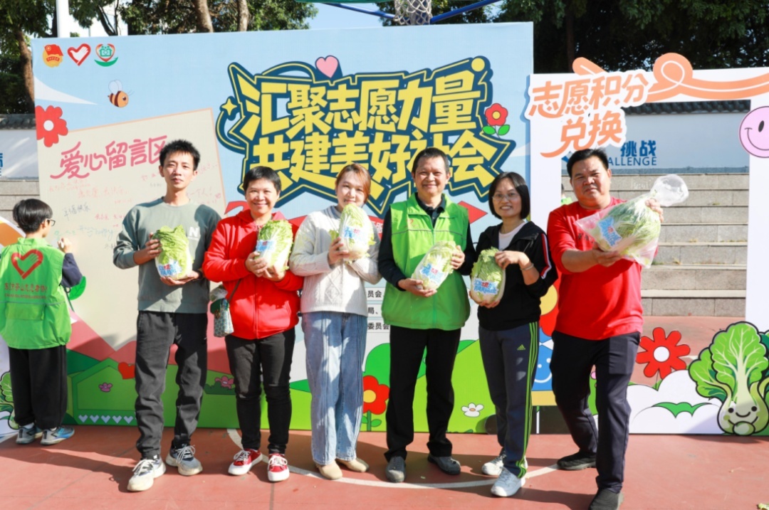 行径在茶山圩社区党群就业中心举行。行径摊位上,满堆的翠绿白菜相配显眼,志愿者们以志愿就业时数,现场兑换一颗颗崭新白菜。